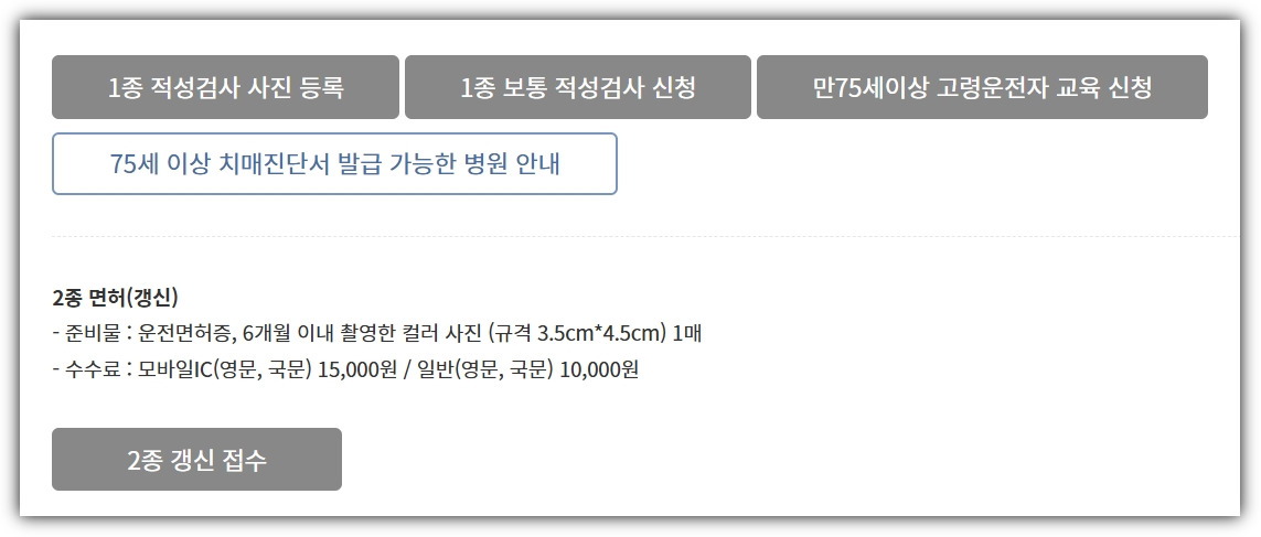 - 2종 면허: 갱신 기간 초과 시 20,000원 (70세 이상은 30,000원)